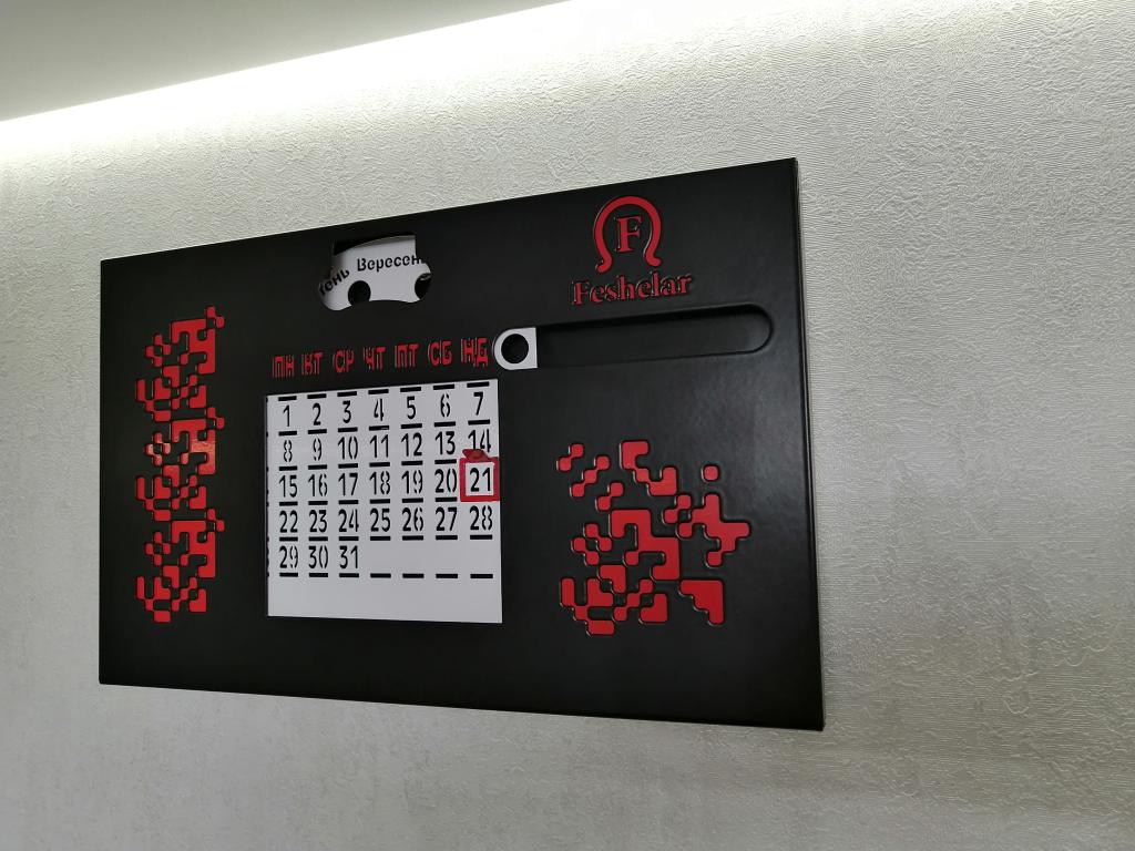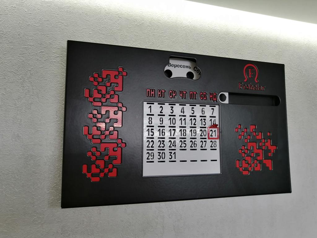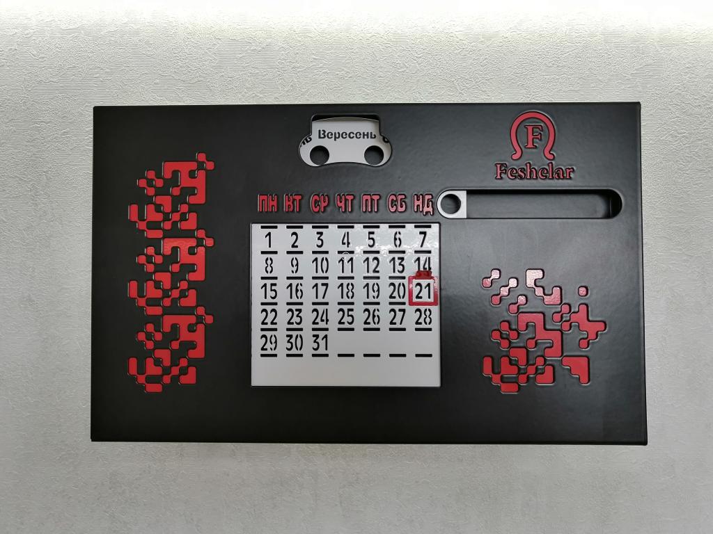 Вічний календар з текстовою українською вишиванкою. Стильний та лаконічний декор для дому, та офісу. Зручний інструмент для планування та організації часу. Зроблений зі сталі товщіною 0,7мм, пофарбований порошковою фарбою, у чорному матовому кольорі він буде контрастувати з більшістю сучасних інтерьерів, також на ньому вирізана текстова українська вишиванка з зашифрованими побажаннями - добра всім, яке так потрібно, нам зараз.